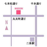 〒604-0077 京都市中京区丸太町通七本松東入ル北側 より大きな地図で バーラウンジMIDORI を表示 丸太町通り七本松の交差点を、東へ30メートルほど直進した北側です。